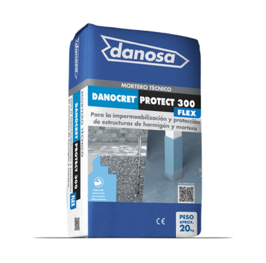 DANOCRET PROTECT 300 FLEX es un membrana cementosa PCC flexible e impermeable monocomponente para la protección superficial e impermeabilización del hormigón y el mortero. Formulado a base de conglomerantes hidráulicos, áridos seleccionados y polímeros que le proporcionan una excelente elasticidad, adherencia y capacidad impermeabilizante.